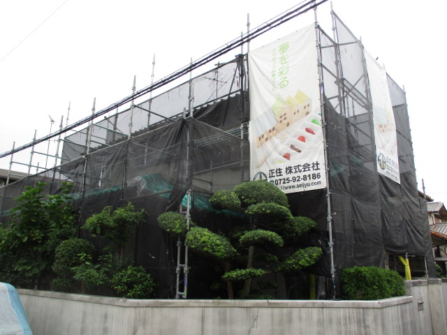 四方を、足場で囲むとともに、当社のサインシートも、さりげなく?、掛けさせてもらうことに…。
