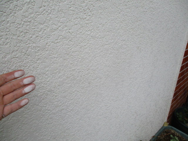 塗料の中の合成樹脂などが分解され、その結果、表面に白い粉となって現れてくる劣化現象です。