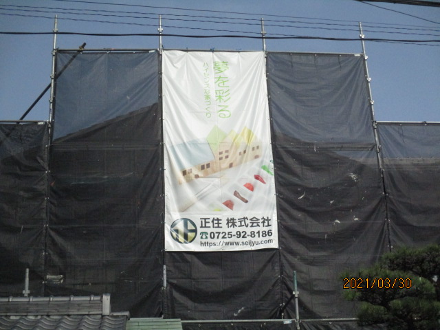近隣へのご迷惑挨拶の意味も兼ねて、我が社の養生サインシートを掛けさせて頂きました。